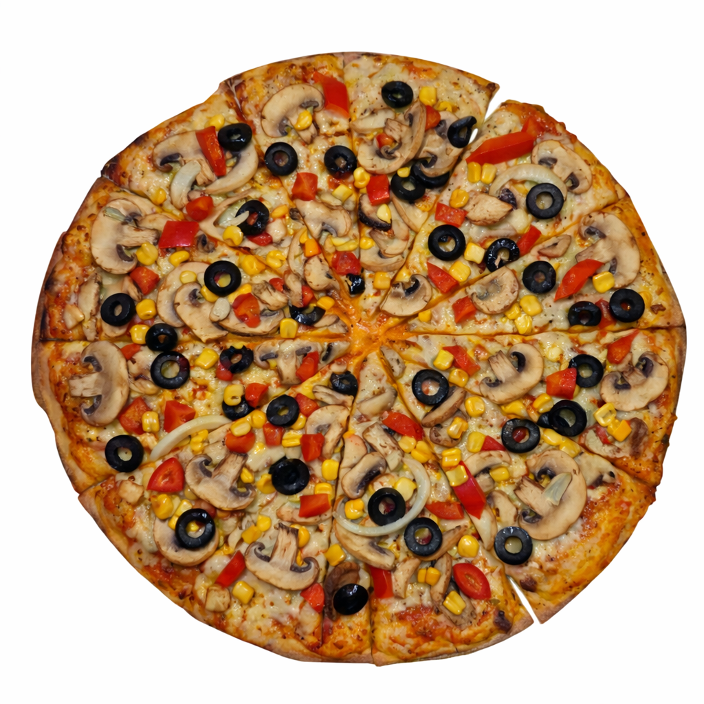 (Campiñones, Aceitunas negras, Cebolla, Pimentón y Maíz + Borde de Queso)